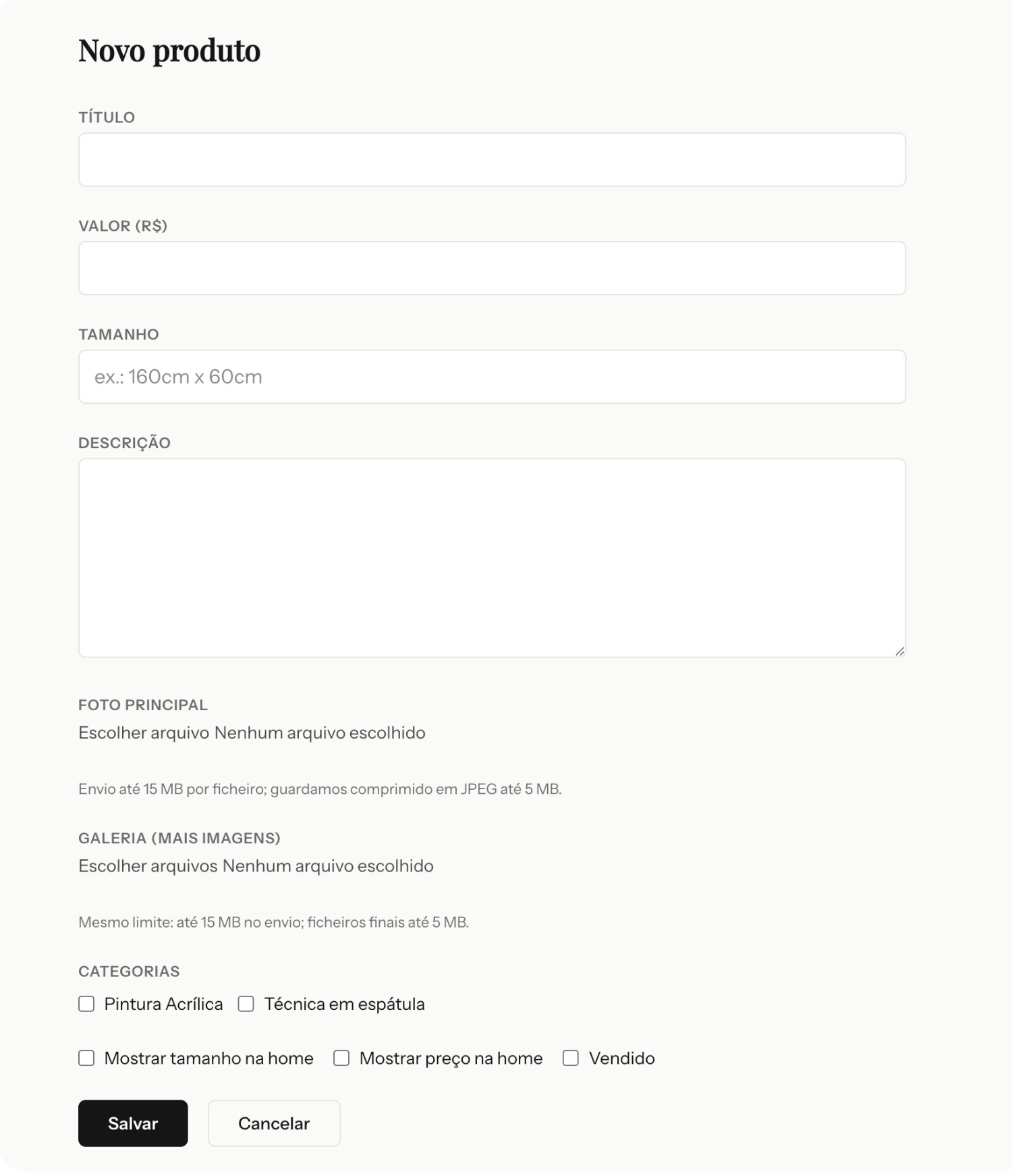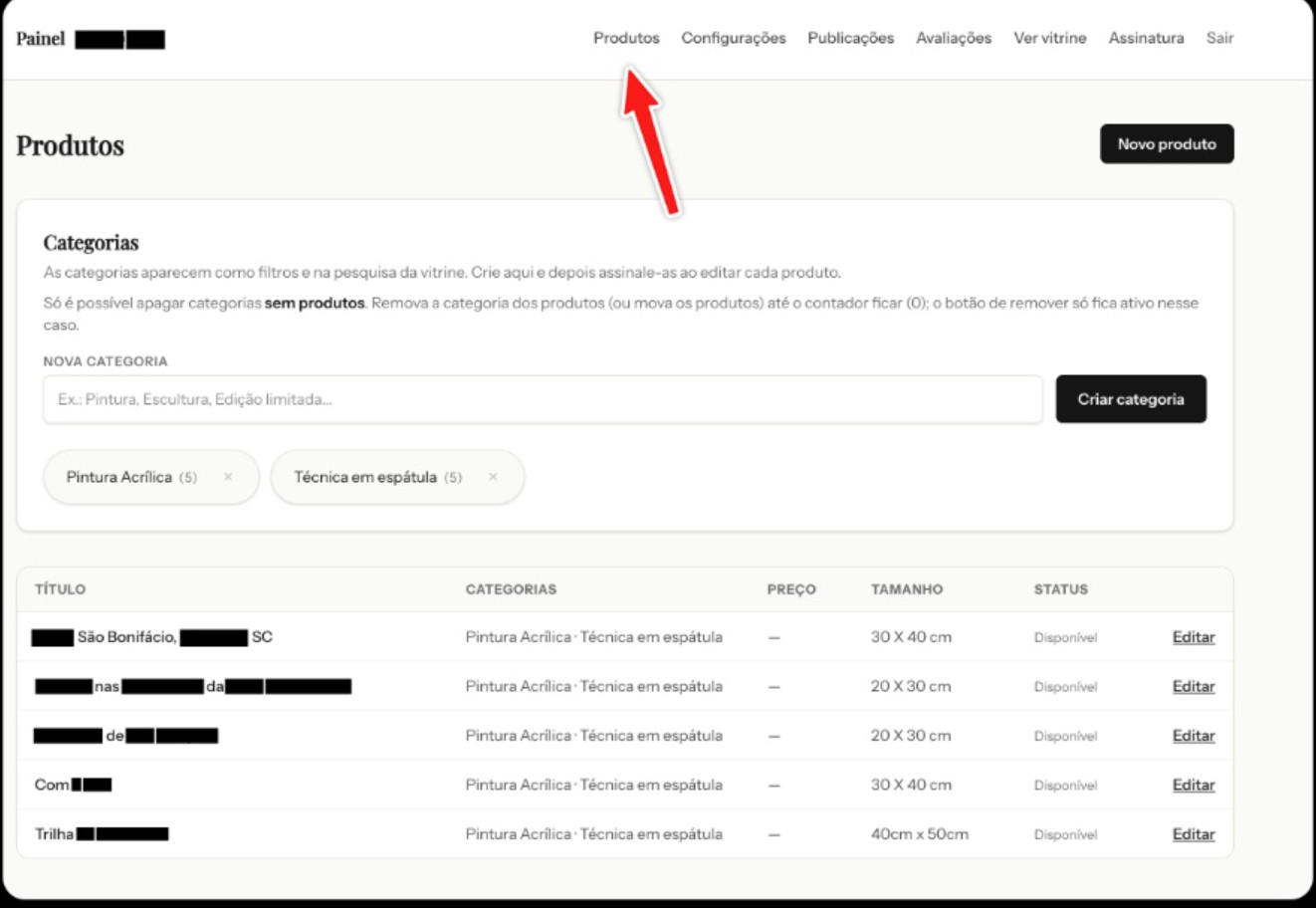 - Categorias: Você pode organizar suas obras por técnica (ex: "Pintura Acrílica", "Esculturas"). Se a categoria ainda não existir, você a cria ali mesmo na tela de listagem de produtos.