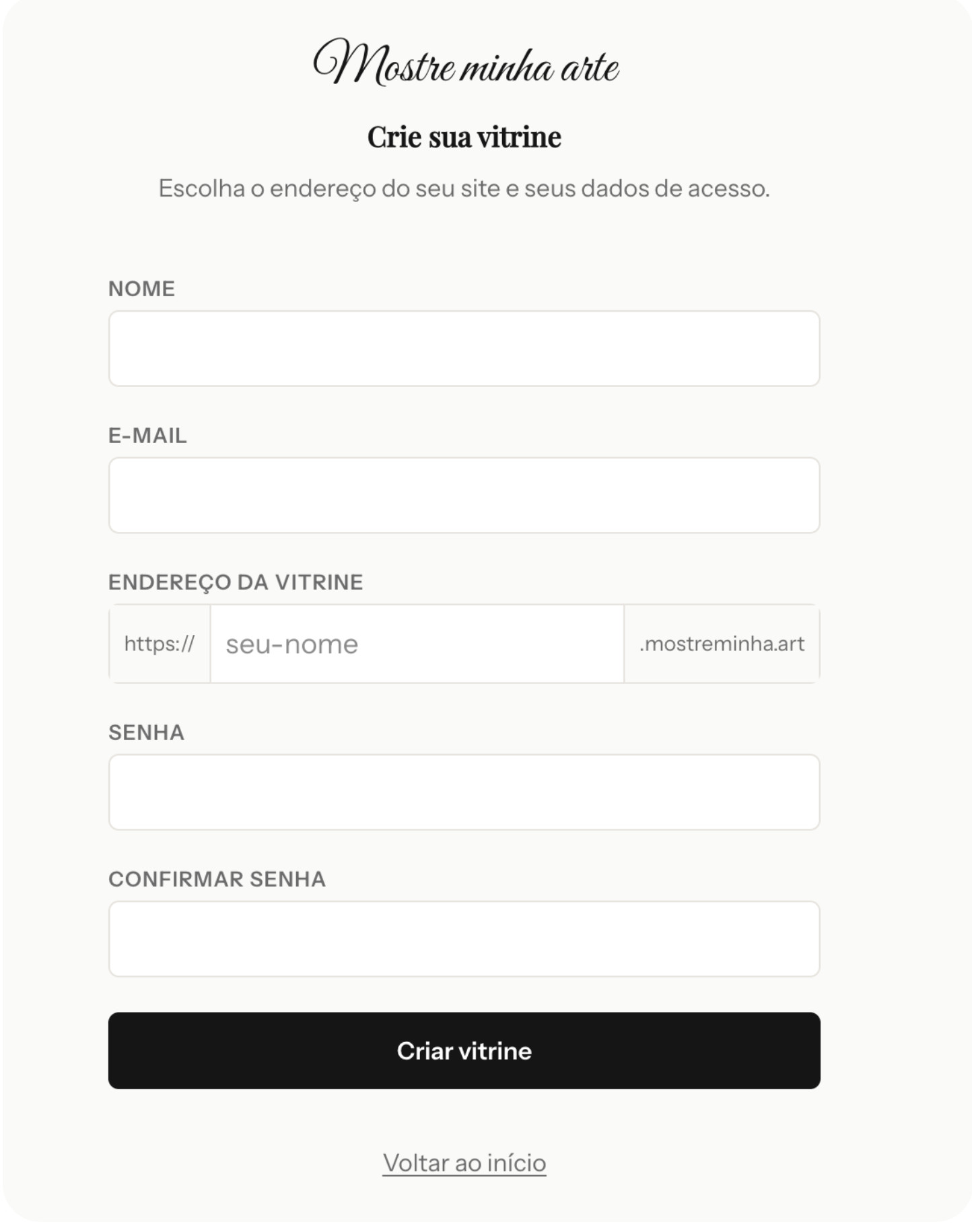 - Dica de Ouro: No campo "Endereço da Vitrine", escolha algo simples, como seu nome artístico (ex: guilherme.mostreminha.art). Esse será o link que você vai colocar na sua bio do Instagram.